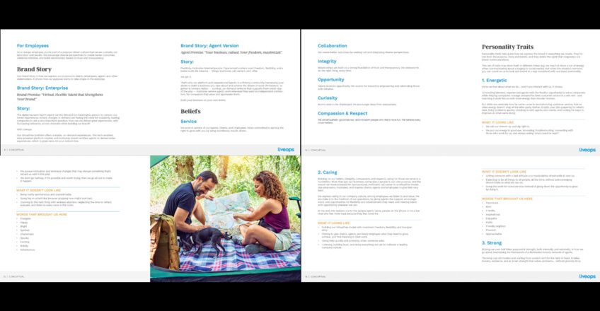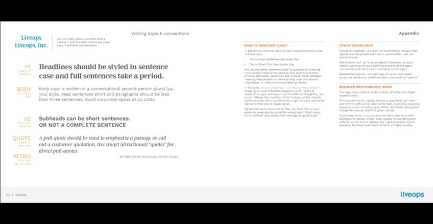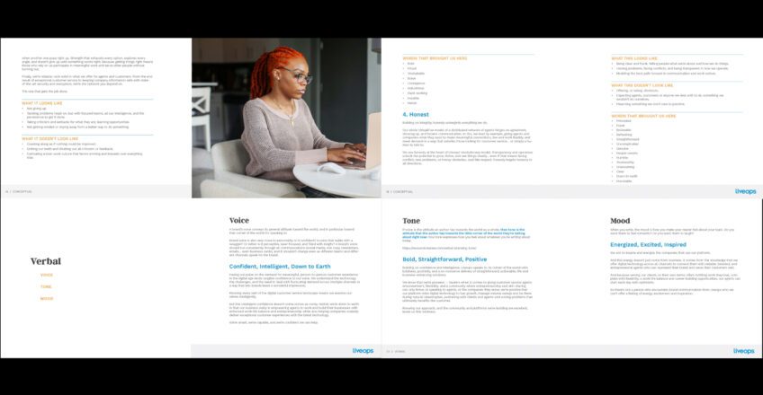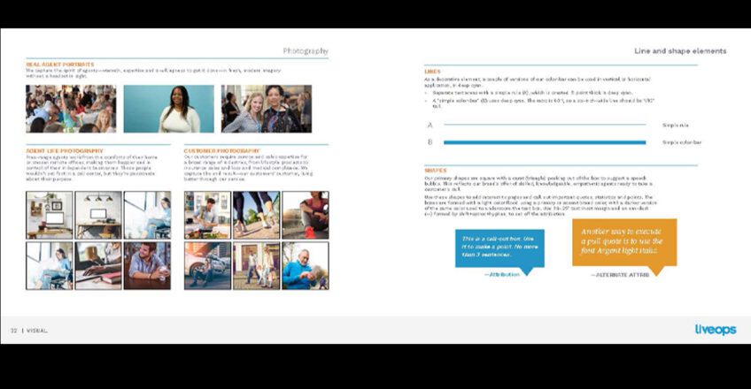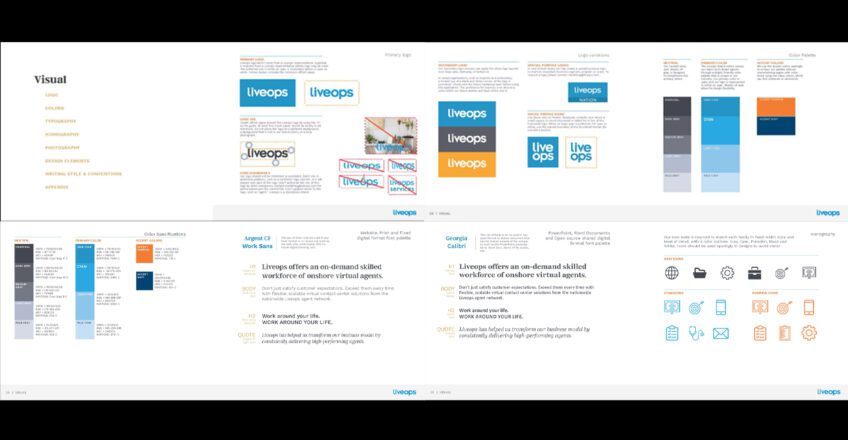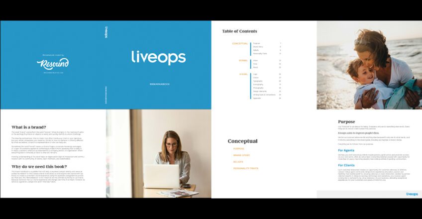 The design of the “Remarkabook” booklet for LiveOps was designed by myself, when I was the Creative Services Manager for Liveops. The booklet was built by Resound Creative, who was helping us with our brand repositioning, and follows a clean, structured, and brand-consistent approach. It uses a vibrant, warm color palette centered around cyan, with accent colors like pumpkin and navy, to create an inviting yet professional tone. The typography is clear, with fonts like Argent CF and Work Sans used across different media, ensuring legibility and consistency. Visual elements like lines and shapes, particularly the speech-bubble-like carats, reinforce the theme of communication. The layout emphasizes clarity, using ample white space and offsetting text with decorative rules or simple color bars. Photography focuses on authenticity, showcasing real people without the conventional headset imagery. The overall design reflects LiveOps’ brand values of flexibility, innovation, and personal connection.