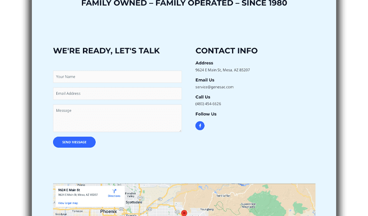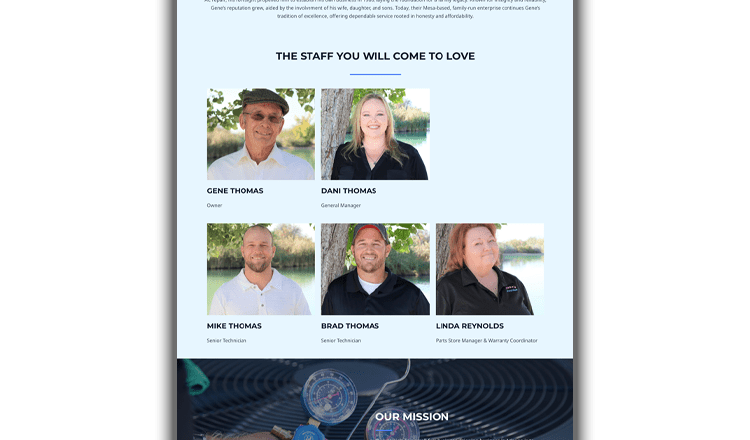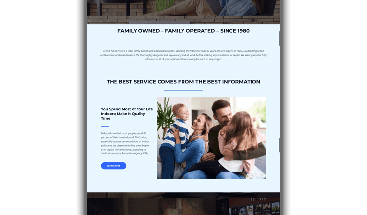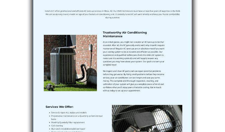 Creating a website for Genes AC Repair involved combining professional design with user-friendly functionality to effectively showcase the company’s services. The site includes essential features like a clear navigation menu, detailed service descriptions, customer testimonials and easy methods of contact. High-quality images and a clean layout enhance the user experience, while integrating SEO best practices help attract more visitors. Additionally, ensuring the site is mobile-responsive and fast-loading provide a seamless experience for all users, ultimately driving more business to Genes AC.