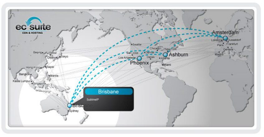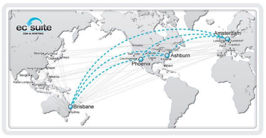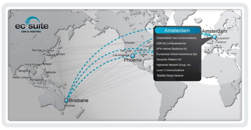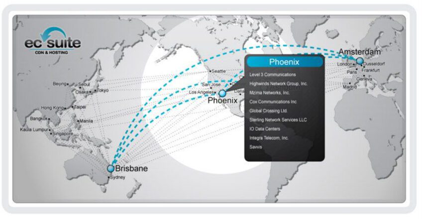 The interactive design of the ECsuite data transfer map effectively illustrates the global reach and connectivity of their services. By displaying key data transfer locations like Amsterdam, Ashburn, Brisbane, and Phoenix, the map provides a clear visual representation of their extensive network. The use of dotted lines to indicate data routes adds a dynamic element, emphasizing the continuous flow of information between these critical points. Pop-up details for each location, highlighting key partnerships and infrastructure, enhance user engagement and provide in-depth insights at a glance. This interactive approach not only makes the complex data easily digestible but also reinforces ECsuite’s commitment to global data transfer excellence.